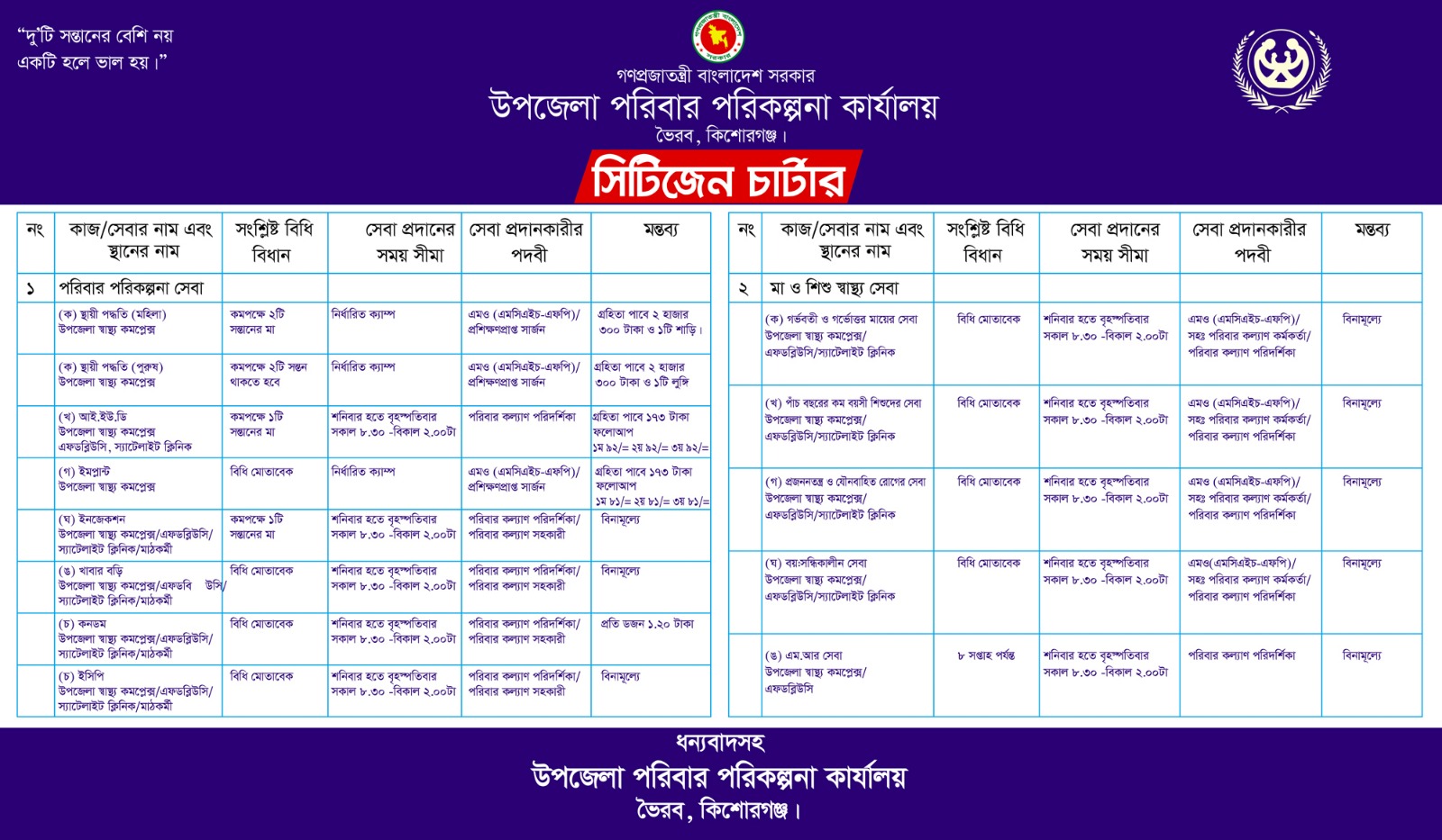 (খ)পরিবার পরিকল্পনা সেবা (বিনা মূল্যে)